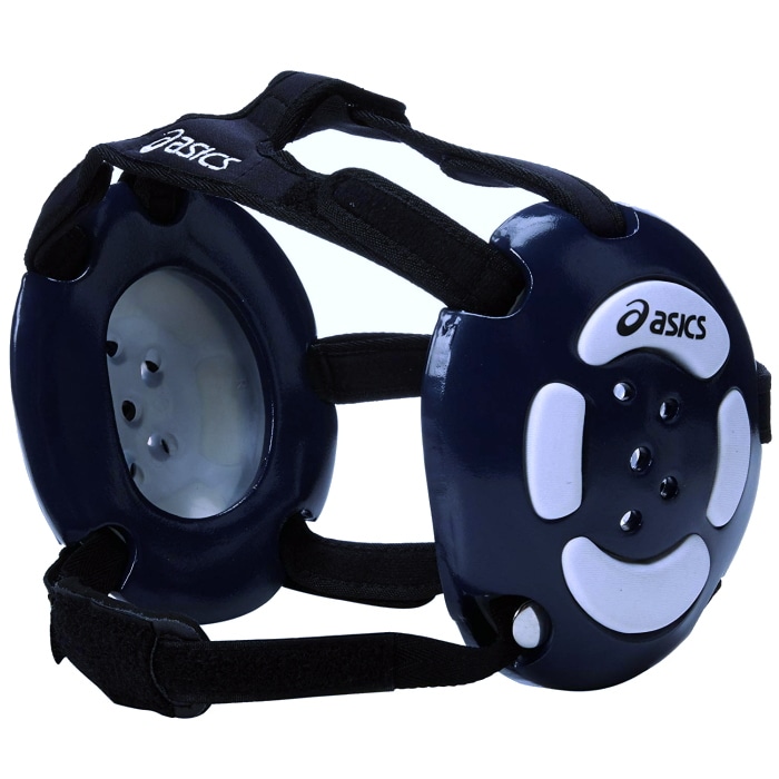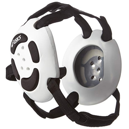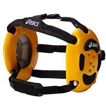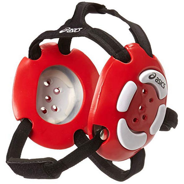 アシックスの上位モデル・イヤーガードです。5本のストラップでガッチリ固定し、パッド部は柔らかいウレタン素材を使用。相手選手への違和感も軽減しています。聴力を妨げることなく耳を防御します。